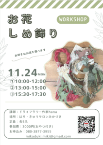 毎年大人気のお花しめ飾りのワークショップの日程が決定いたしました。